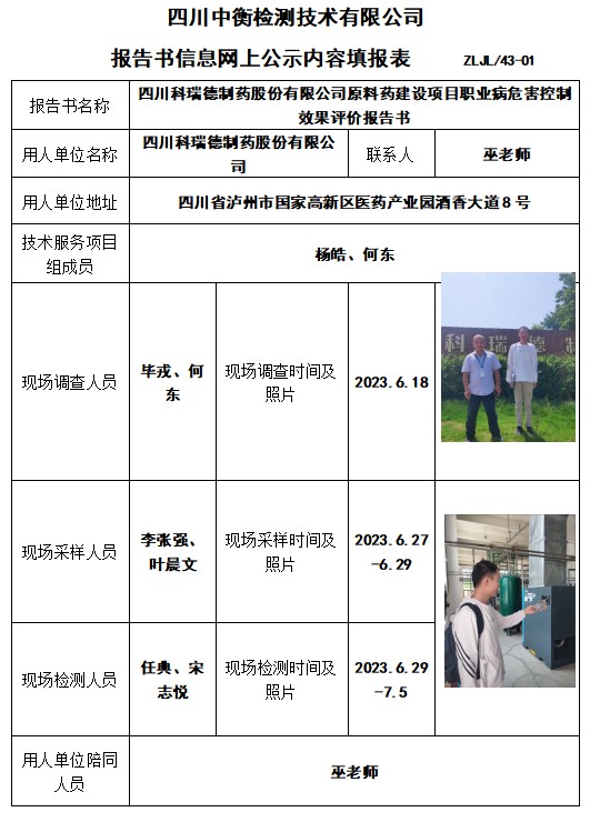 四川科瑞德制藥股份有限公司原料藥建設(shè)項(xiàng)目職業(yè)病危害控制效果評價(jià)報(bào)告書