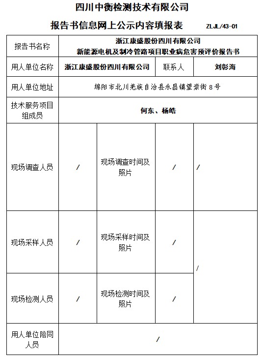 浙江康盛股份四川有限公司 新能源電機及制冷管路項目職業病危害預評價報告書