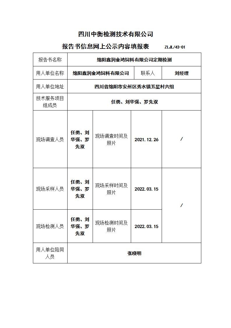 綿陽鑫潤金鴻飼料有限公司職業病危害定期檢測