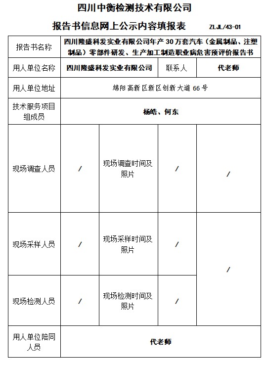 四川隆盛科發實業有限公司年產30萬套汽車(金屬制品、注塑制品)零部件研發、生產加工制造職業病危害預評價