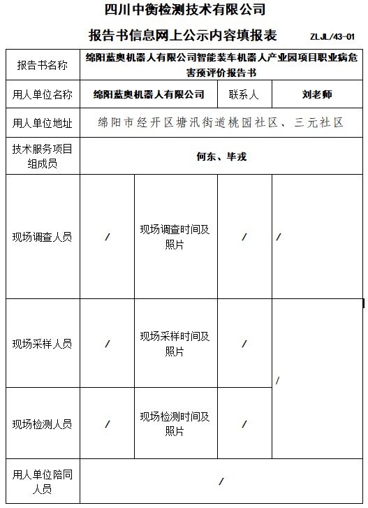 綿陽藍奧機器人有限公司智能裝車機器人產業園項目職業病危害預評價