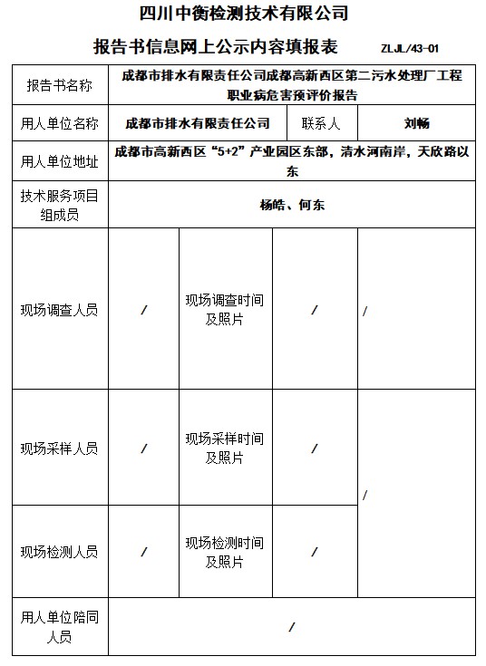 成都市排水有限責任公司成都高新西區第二污水處理廠工程 職業病危害預評價