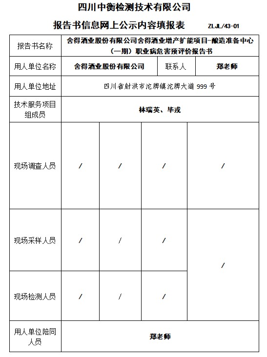 舍得酒業股份有限公司舍得酒業增產擴能項目-釀造準備中心 (一期)職業病危害預評價
