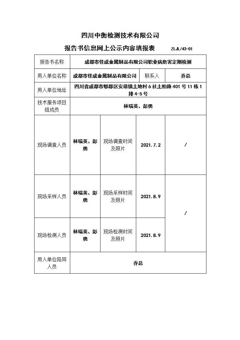 成都市佳成金屬制品有限公司職業(yè)病危害定期檢測