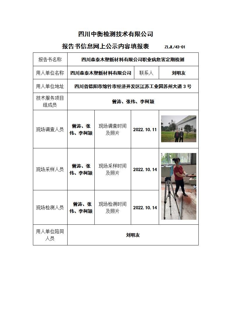 四川森泰木塑新材料有限公司職業病危害定期檢測