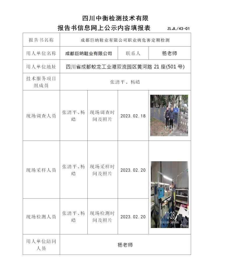 成都巨納鞋業有限公司職業病危害定期檢測