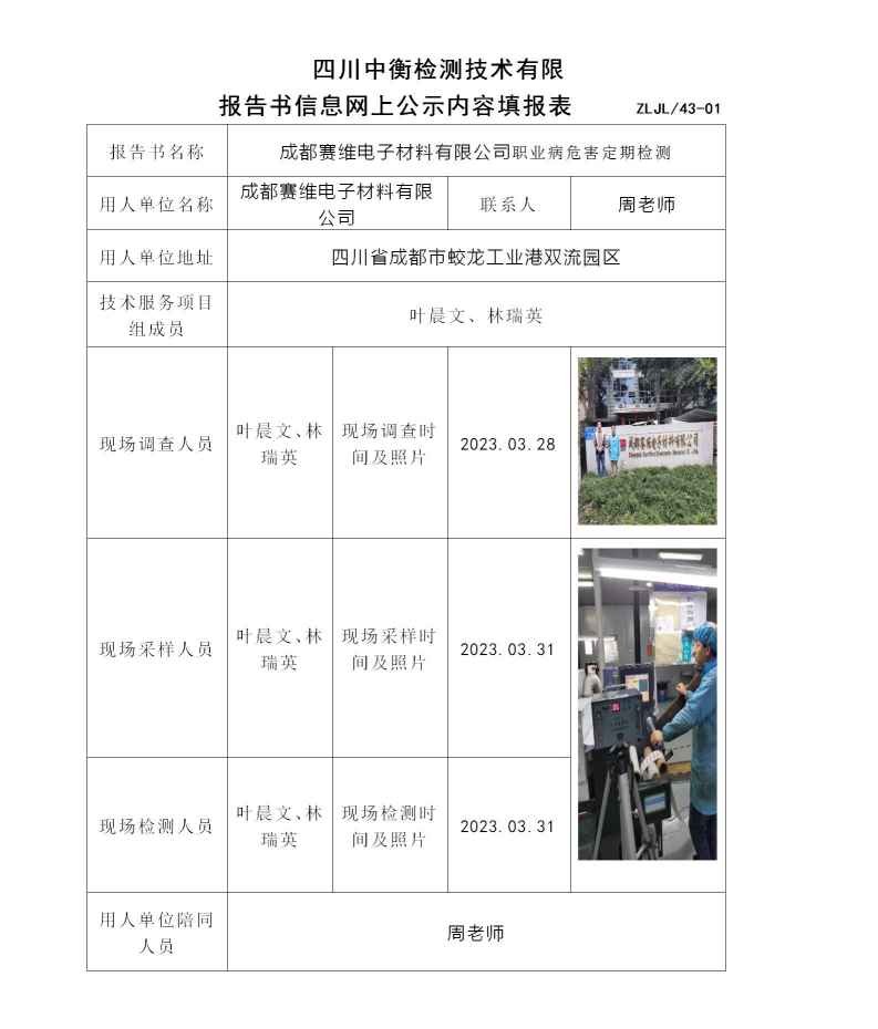 成都賽維電子材料有限公司職業病危害定期檢測