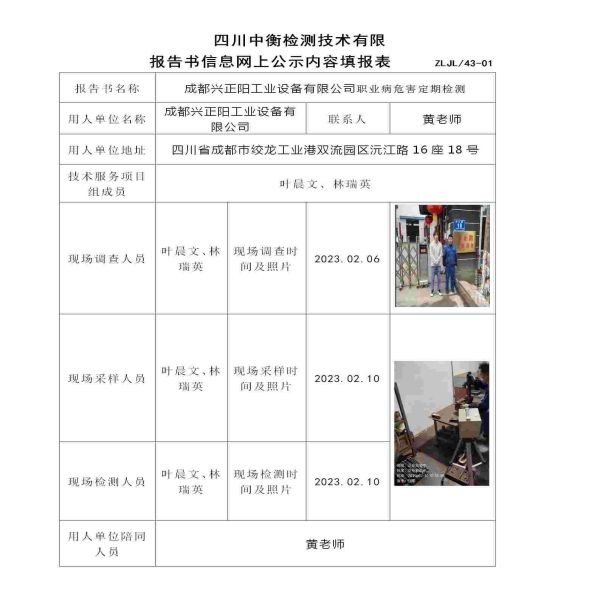成都興正陽(yáng)工業(yè)設(shè)備有限公司職業(yè)病危害定期檢測(cè)