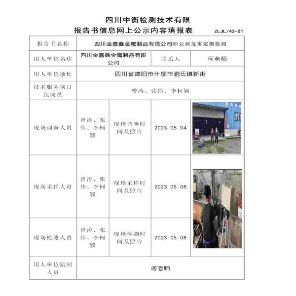四川金嘉鑫金屬制品有限公司職業(yè)病危害定期檢測(cè)