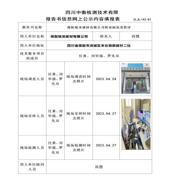 綿陽銳龍建材有限公司職業病危害定期檢測