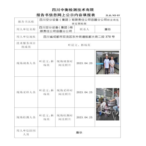 四川空分設備(集團)有限責任公司容器分公司職業病危害定期檢測