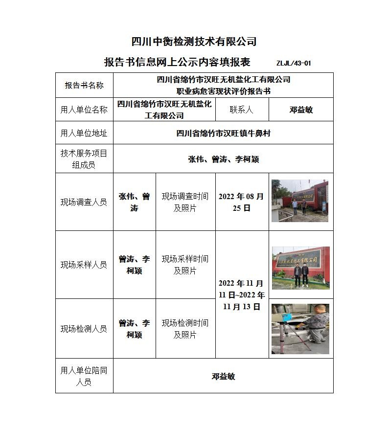 四川省綿竹市漢旺無機鹽化工有限公司 職業病危害現狀評價