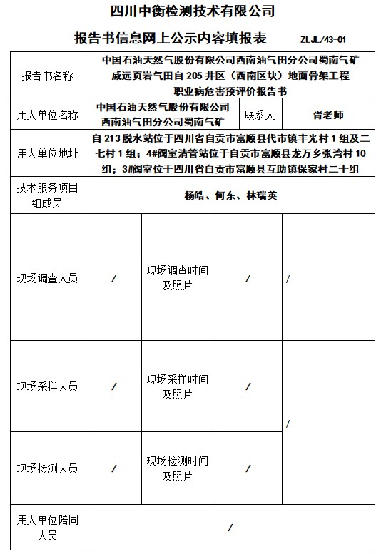 中國石油天然氣股份有限公司西南油氣田分公司蜀南氣礦 威遠頁巖氣田自205井區(西南區塊)地面骨架工程 職業病危害預評價報告書