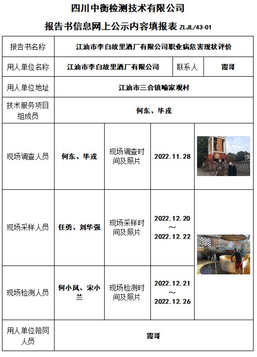 江油市李白故里酒廠有限公司職業病危害現狀評價