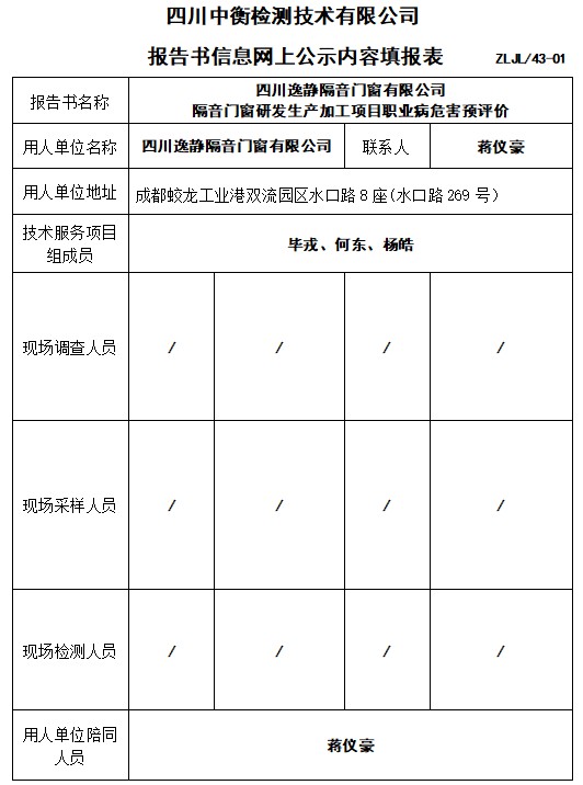 四川逸靜隔音門窗有限公司 隔音門窗研發生產加工項目職業病危害預評價