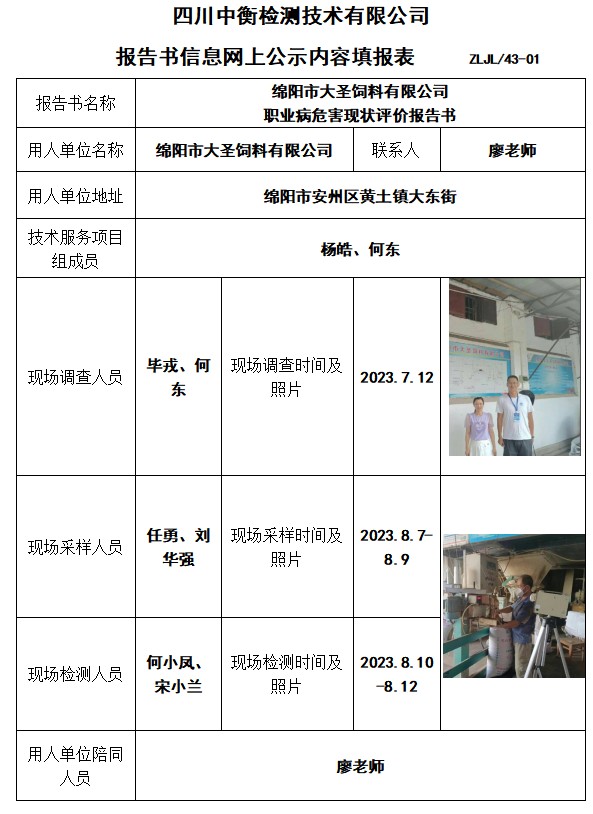 綿陽市大圣飼料有限公司 職業病危害現狀評價報告書