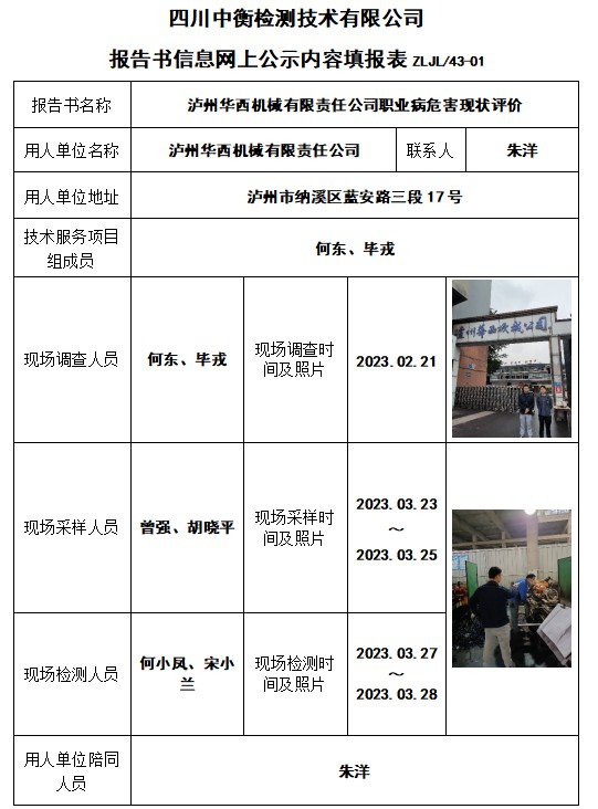 瀘州華西機械有限責任公司職業病危害現狀評價