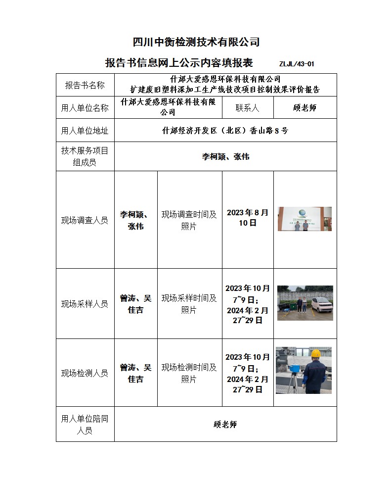 什邡大愛感恩環(huán)保科技有限公司 擴(kuò)建廢舊塑料深加工生產(chǎn)線技改項(xiàng)目 職業(yè)病危害控制效果評價(jià)報(bào)告書
